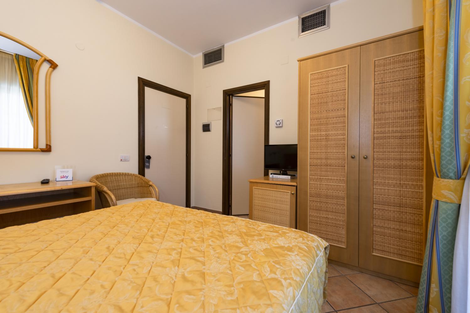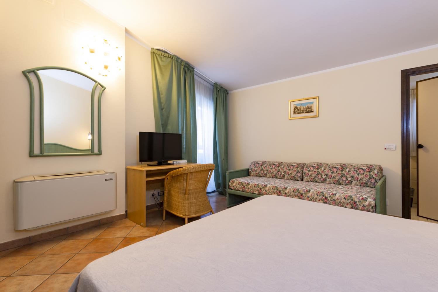 Sono le nostre camere più grandi, ne abbiamo soltanto tre di questa tipologia, una al secondo piano, la più grande, un vero e proprio mini-appartamento, le altre due al primo piano, entrambe molto spaziose. Sono camere caratterizzate da due stanze comunicanti e bagno in comune, ideali per famiglie fino a quattro persone. Dotate di doppia televisione LCD 32" (una per camera) con Sky Gold gratuito indipendente, frigo-bar, scrivania, telefono, bagno con doccia, asciugacapelli, kit cortesia, aria condizionata / riscaldamento autonomo, ampio balcone, connessione ad Internet gratuita tramite Wi-Fi.